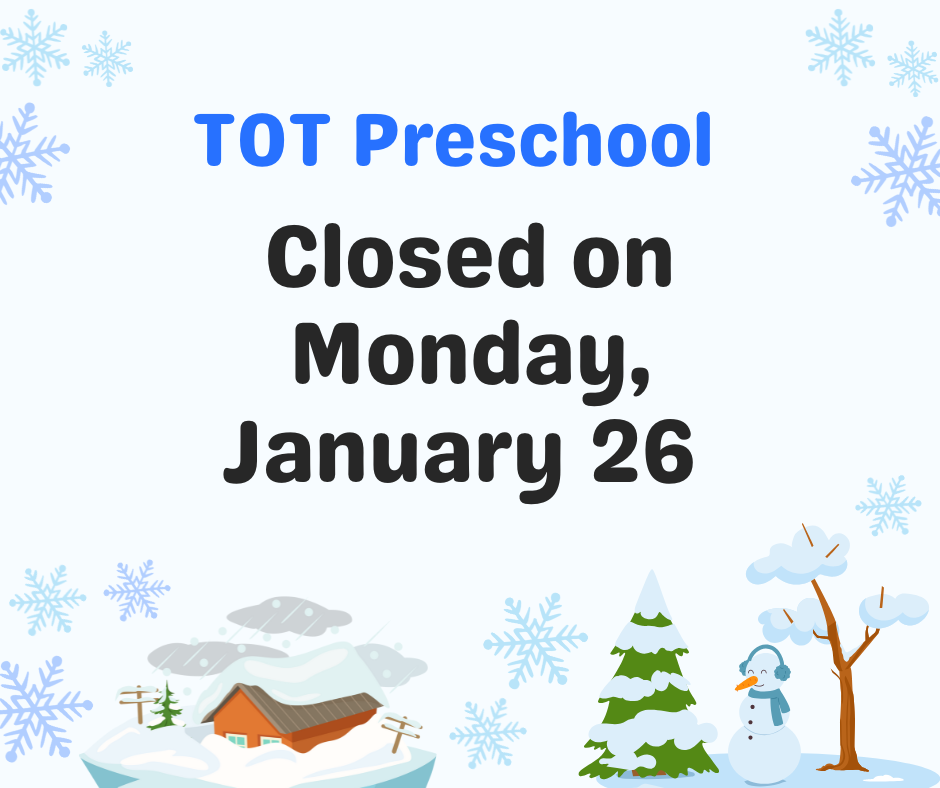 Sydenstricker United Methodist Church office and TOT Preschool will be closed on Monday, January 26. A decision about Tuesday, January 27, will be made on Monday afternoon.
